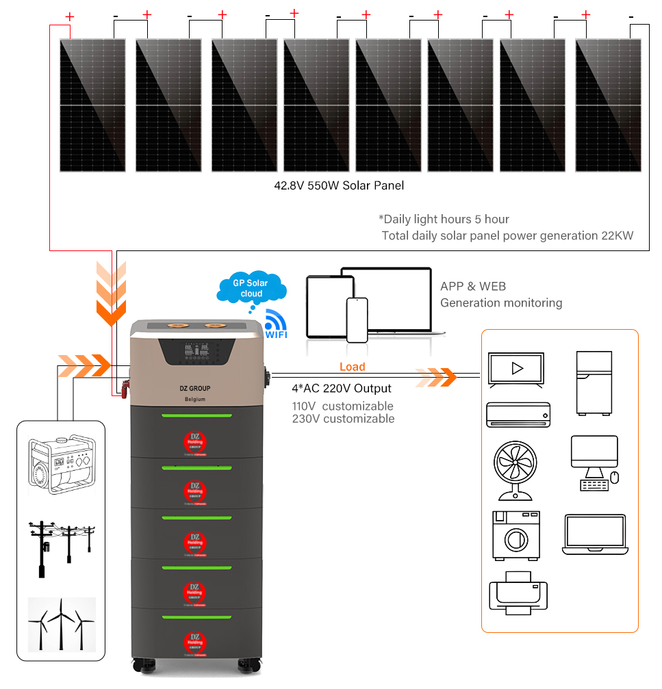 Modular stacking design. Hybrid Inverter with lithium ion battery and mppt controller. Stackable LiFePO4 battery modules and hybrid inverter module, easy capacity expansion Selectable priority between solar batteries or mains to feed the output Wide range of selectable mains input voltage (110V/220V/230V/240V) Protection for over-discharge, overload, over tempearture, short circuit protection, ets Support communication interface RS232, RS485, CAN, Bluetooth