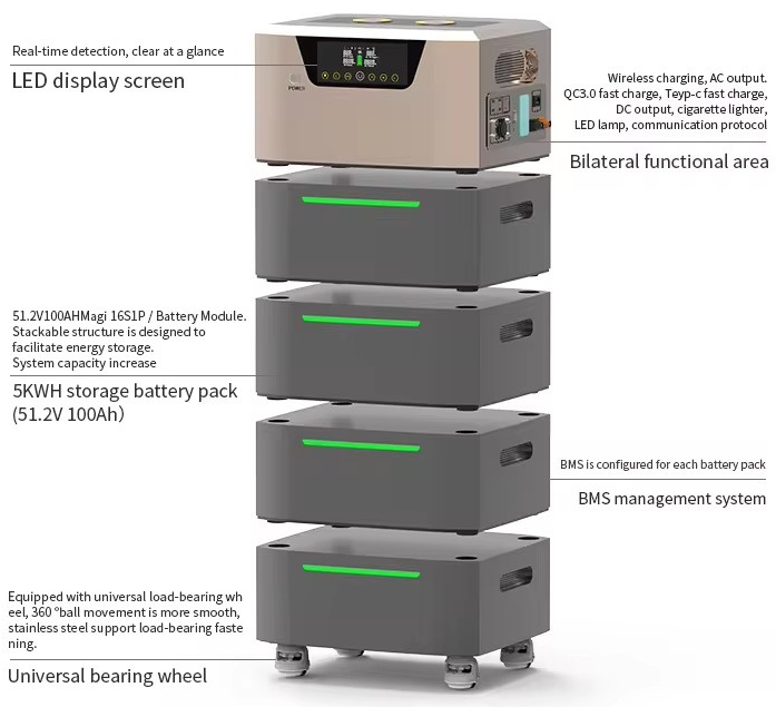 2. Stackable LiFePO4 battery modules and hybrid inverter module, easy capacity expansion